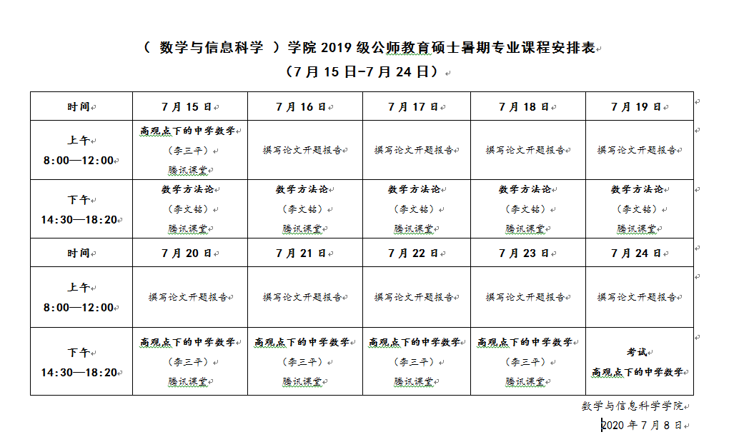 数学与信息科学公司2020级公师教育硕士暑期专业课程安排表