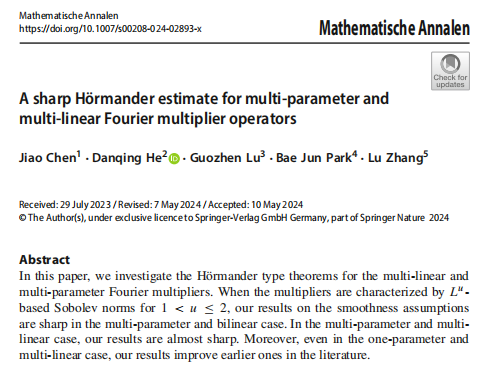 Chen, J., He, D., Lu, G. et al. A sharp Hörmander estimate for multi-parameter and multi-linear Fourier multiplier operators. Math. Ann. (2024).(https://doi.org/10.1007/s00208-024-02893-x)