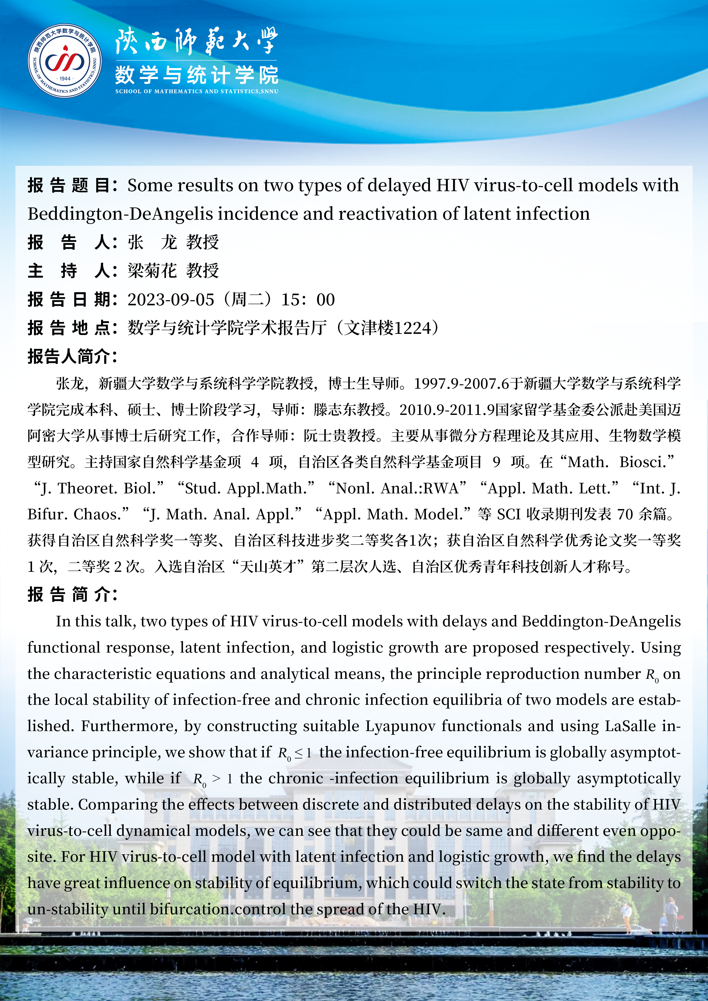 1.Some results on two types of delayed HIV virus-to-cell models with Beddington-DeAngelis incidence and reactivation of latent infection 2.几类媒介传染病的数学建模与分析