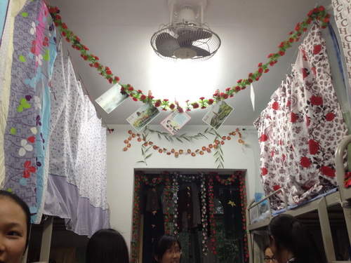 从“陋室铭”的别出心裁,到申报书的创新设计,再到桌上的摆放的小盆景,同学们的宿舍处处都让评委们眼前一亮。其中,陋室铭为“风之谷”的宿舍成员采用各种颜色的手工风车以及蓝天白云壁纸装饰寝室,并介绍了她们的装扮主题是像风一样自由。而采用毛地毯、茶几、木柜等家居用品装饰寝室的“谨行阁”展现了家的温馨。此外,“荷馨怡小清新”的照片墙,“婵媛茹梦”使用废弃光碟拼成的墙画,“悠然居”的爱心墙,以及各式的挂帘、风铃、同学们为自己装饰的温馨小床等,充分体现了同学们的创造力、想象力及动手能力。