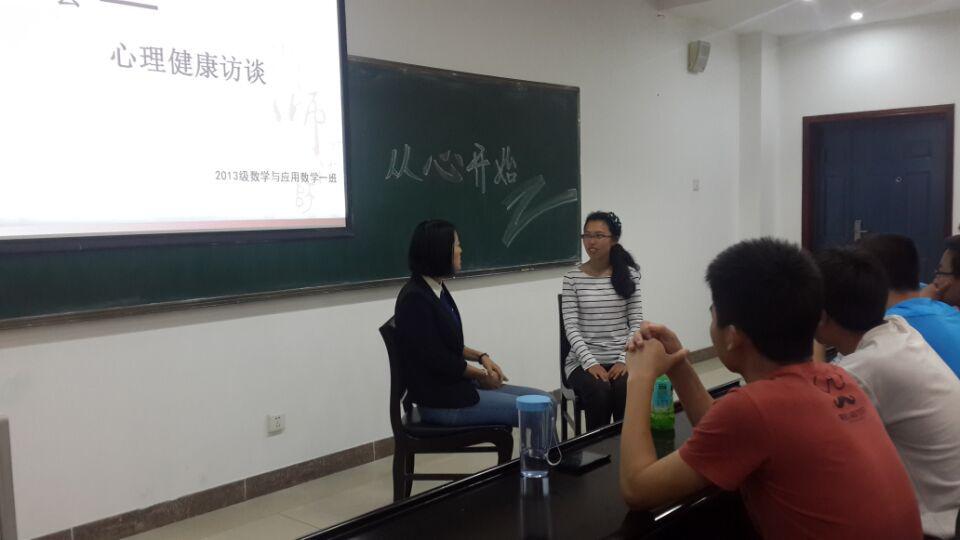 (杜永超报道)2015年5月14日晚七点半2013级应数一班心理健康访谈主题班会在文津楼二层多功能厅成功举办。心理公司教师吕薇作为特邀嘉宾参加了此次班会。