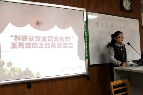 11月25日下午,公司第五届科研创新主题文化节学习竞赛经验交流会在文津楼615教室成功举行。2015级研究生王海伟、2012级本科生李爽、2013级本科生李慧敏、刘萤结合自身的学习及参赛经历与同学们进行了经验交流。大会由2014级本科生姜彦蓉主持。