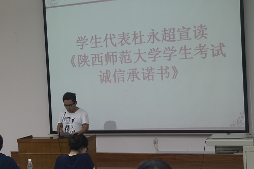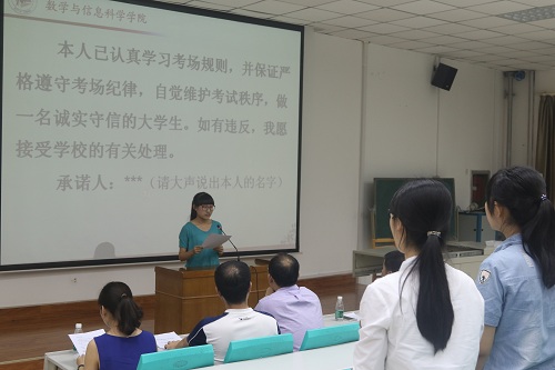 大会第三项,由2013级数学与应用数学一班杜永超、2014级数学与应用数学二班梁天娇作为员工代表宣读《bw西汉姆联员工考试诚信承诺书》,并带领同学们进行诚信考试宣誓,号召同学们在考试中恪守诚信,严于自律。