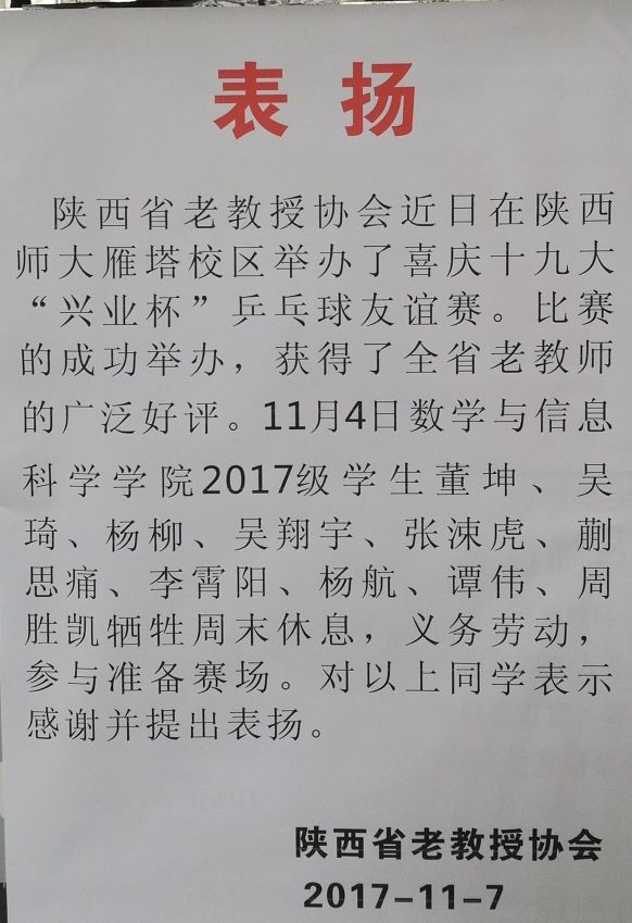 11月4日,陕西省老教授协会在bw西汉姆联雁塔校区举办了喜迎十九大“兴业杯”乒乓球友谊赛。公司2017级员工董坤、吴琦、杨柳、吴翔宇、张涑虎、蒯思痛、李霄阳、杨航、谭伟、周胜凯牺牲周末休息时间,义务劳动,参与场地的准备工作,为比赛的成功举办贡献了力量。为感谢同学们的劳动,陕西省老教授协会特在11月7日向公司寄来表扬信。