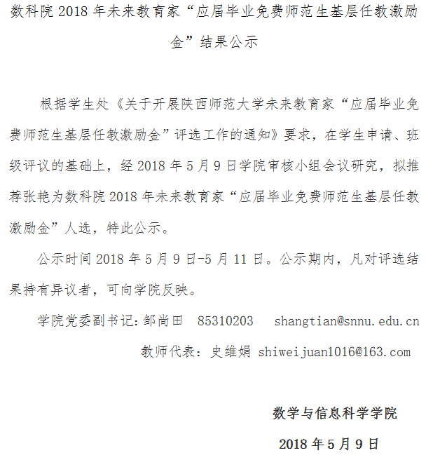 数科院2018年未来教育家“应届毕业免费师范生基层任教激励金”结果公示