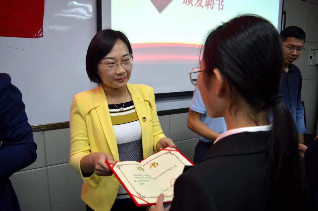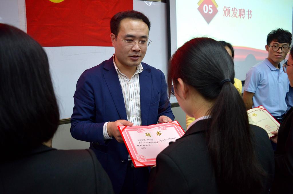 接着,大会到了隆重而又激动人心的时刻,公司党委副书记邹尚田、团委书记王鑫、本科生辅导员鞠恩霞、张伟超、任灵以及白扬华为新一届员工会干部颁发聘书,并合影留念。