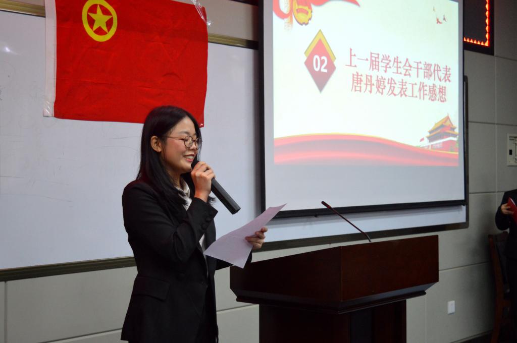 大会第二项:上一届员工会文艺副主席唐丹婷代表发言。她对2017学年度数科院员工会工作做了总结,其中包括爱数行动、迎新晚会、校运会等大型活动,表达了对数科院员工会工作的热爱与怀念,并分享了工作心得,也为新一届员工会干部送上了祝福。