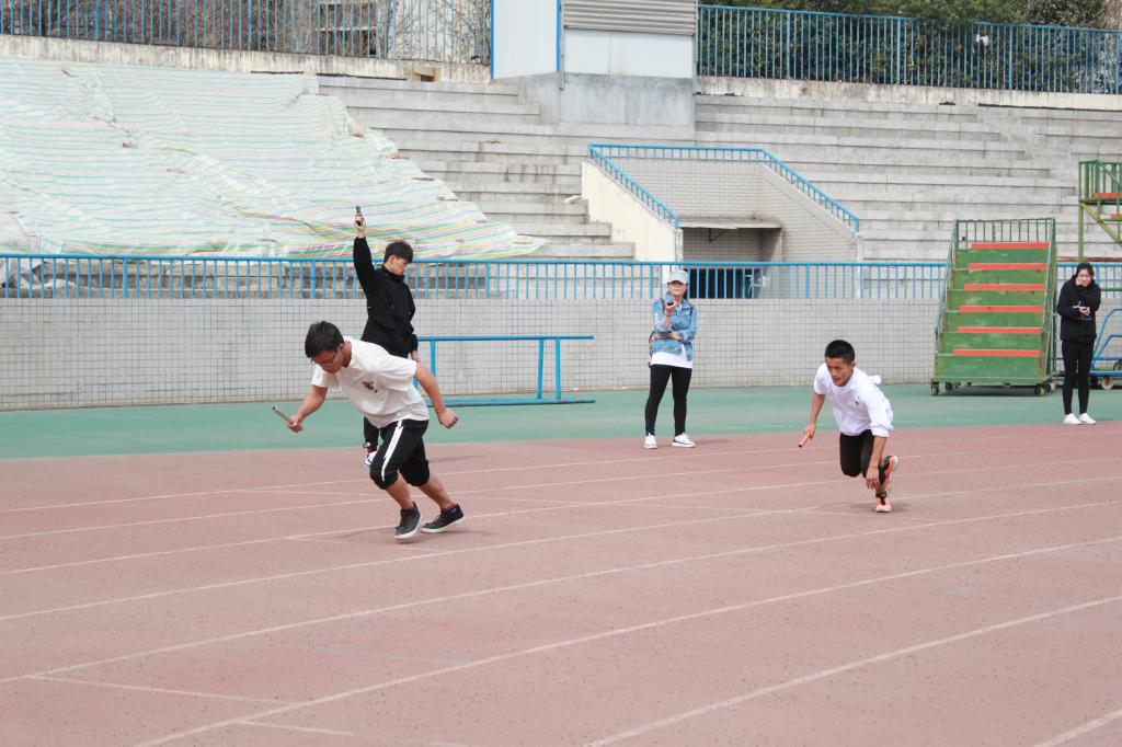 首先进行的是4*100米接力表演赛。老师和同学们共同竞技,大家努力摆动双臂,奋力向前飞奔,课堂上是互相尊敬的师生,运动场上也是互相配合的队友。